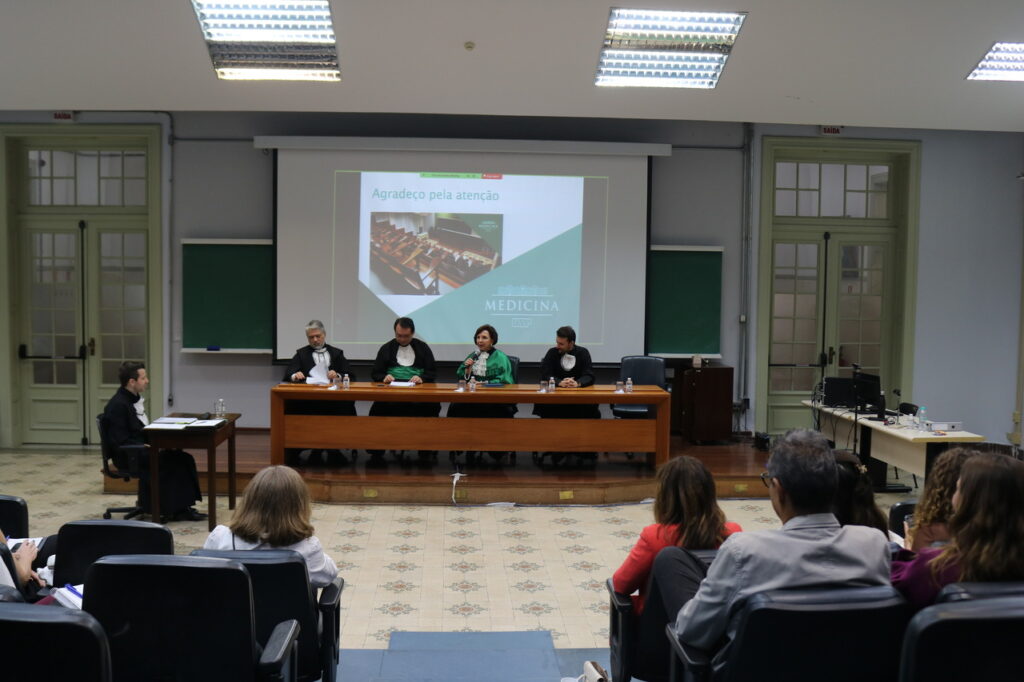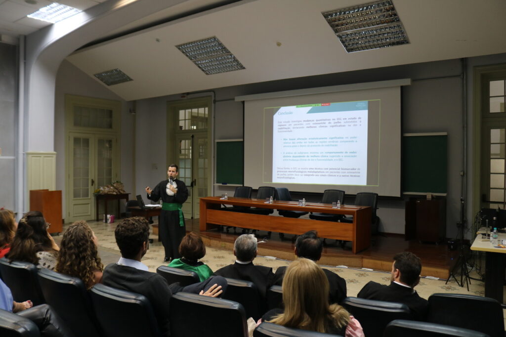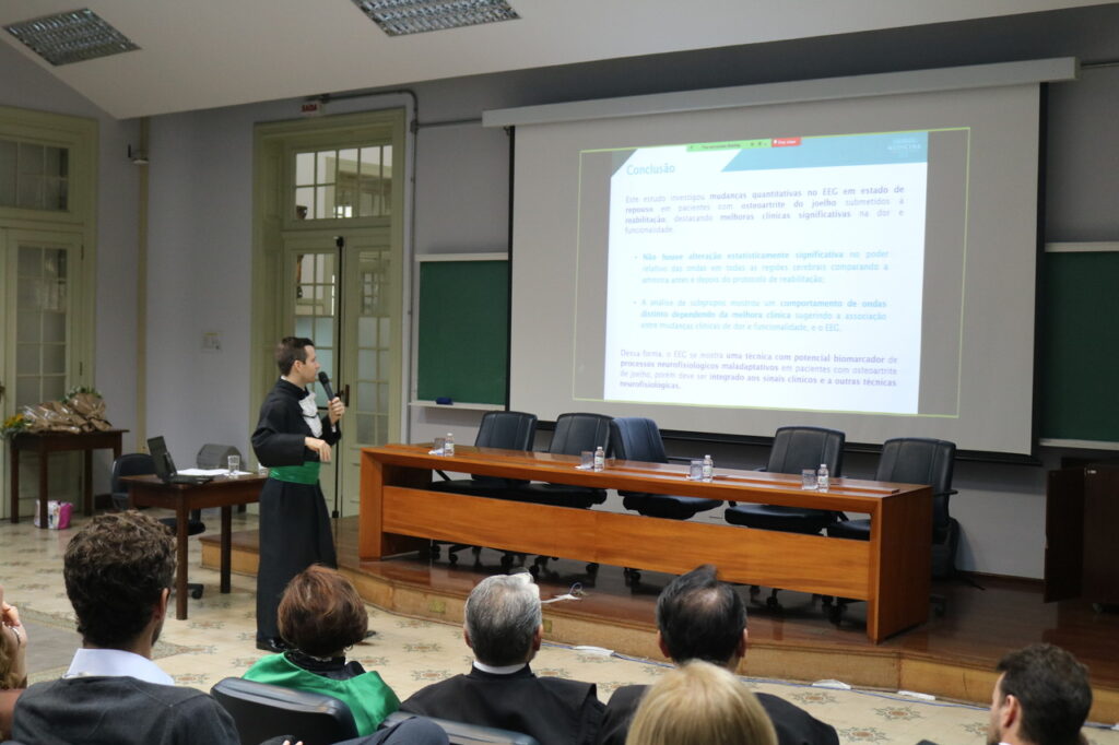 Durante a apresentação, o doutorando destacou a relevância da reabilitação física na qualidade de vida dos pacientes e abordou amplamente temas como sensibilização central, osteoartrite do joelho e o uso da eletroencefalografia como ferramenta de avaliação na reabilitação.