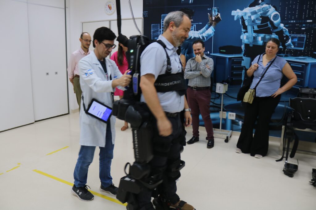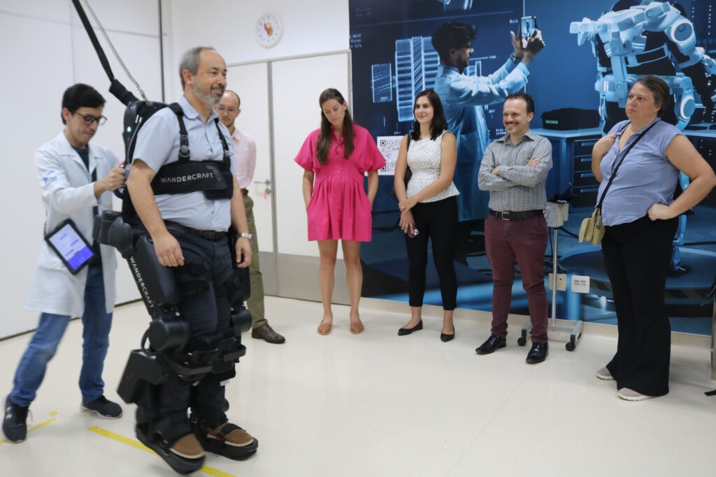 Durante a visita, o grupo foi recebido pelo Dr. Vinícius Delgado Ramos, Diretor Executivo do IMREA, que destacou a importância da tecnologia para os projetos de pesquisa. “O exoesqueleto é um avanço tecnológico considerável para pacientes com dificuldade de mobilidade que precisam adquirir força, equilíbrio e melhora da funcionalidade”, afirmou.